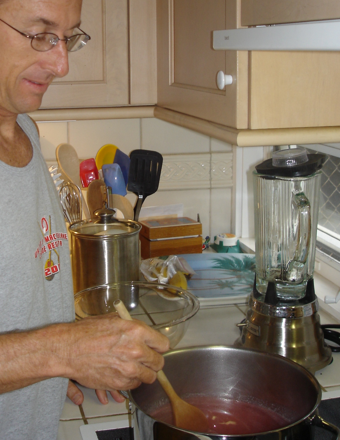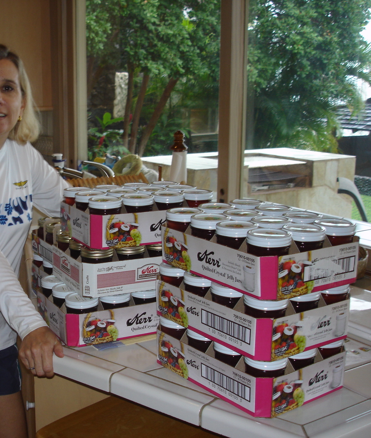 Now you’re ready to make the jelly, half a case at a time. This requires two boxes of pectin per case, to help it set up, and lots and lots of sugar. I’m not going to tell you how much, because it’s enough to send you into a diabetic coma just thinking about it. Anyway. You boil the juice with the pectin, then add the sugar and bring it back to a boil, which you let it do for about two minutes.